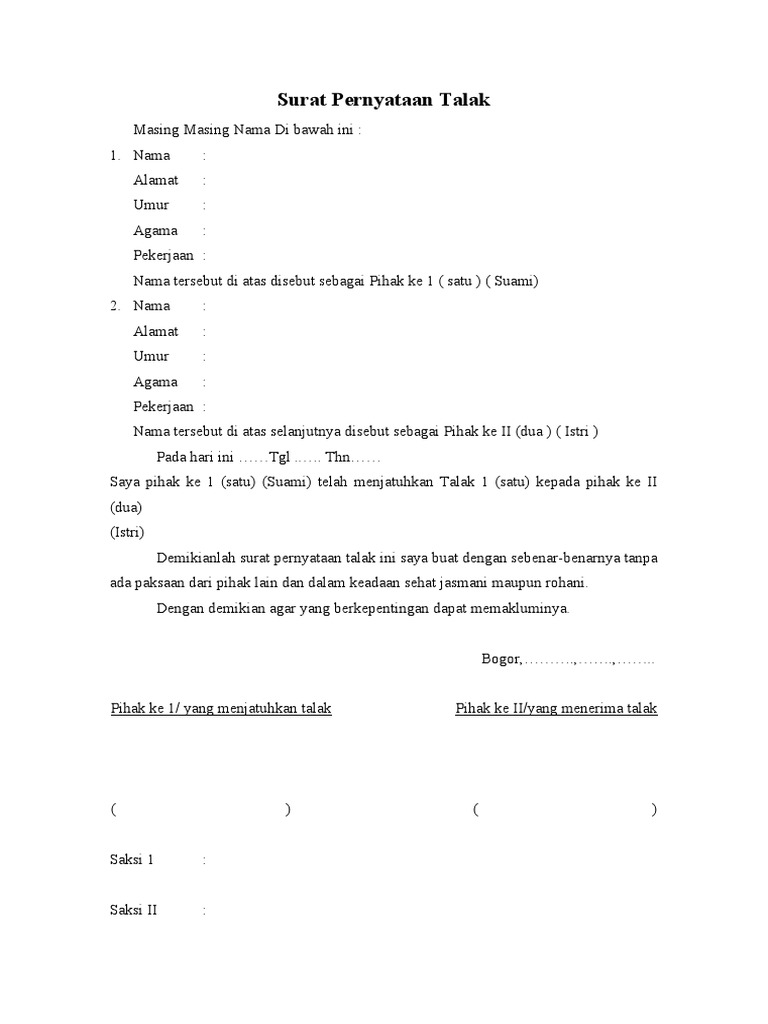 Contoh Surat Talak 3 from imgv2-1-f.scribdassets.com Contoh surat perjanjian perjanjian adalah suatu bentuk peristiwa di mana ada seorang atau pihak yang berjanji kepada orang atau pihak lain dimana kedua belah pihak tersebut saling berjanji untuk melaksanakan hal kesepakatan yang telah disetujui bersama. 19+ contoh surat penawaran kerjasama jasa. Permohonan cerai kepada yth ketua pengadilan agama muara bungo di pengadilan agama muara bungo jl. Popular posts contoh surat cinta untuk ibu guru. Contoh surat permohonan cerai talak doc have a graphic associated with the other.contoh surat permohonan cerai talak doc it also will include a picture of a kind that could be observed in the gallery of contoh surat permohonan cerai talak doc. The collection that comprising chosen picture and the best among others. Tanjung belit, 02 agustus … Contoh surat cerai akan aku bahas di sini.